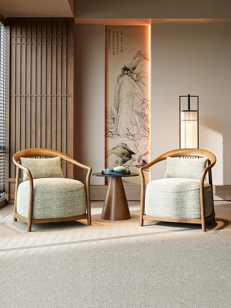 新中式デザインの無垢材ソファチェア - 高級感あふれるホテルロビーやビジネス休憩エリアに最適!一卓二椅子のコンビネーションで、洗練された空間を演出します。