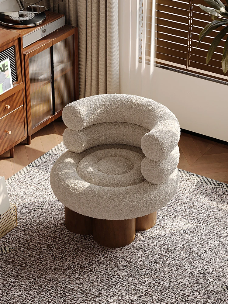 フランス風ヴィンテージクリームカラーのマシュマロ一人掛けソファ、インスタ映えするリビングやバルコニーにぴったり!ふわふわのラムファーで、まるでケーキのようなリラックスチェア。心地よいひとときをお楽しみください!