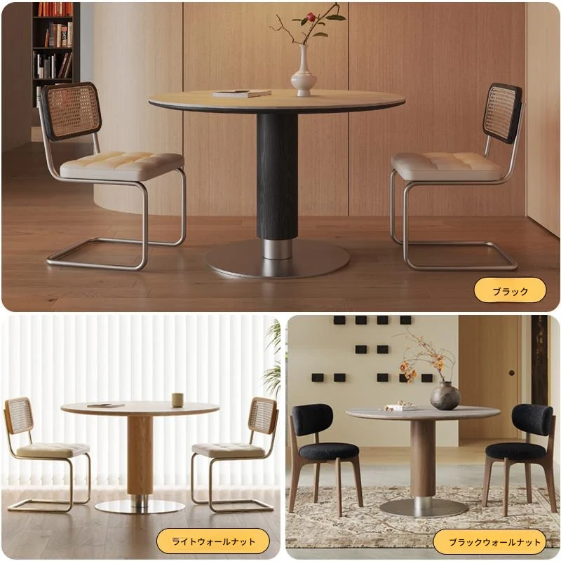 中古風の洞石岩板円卓|小スペースに最適な1mサイズのデザイナーズ天然木ダイニングテーブル&チェアセット|スタイリッシュで温もりある家族の食卓を演出!