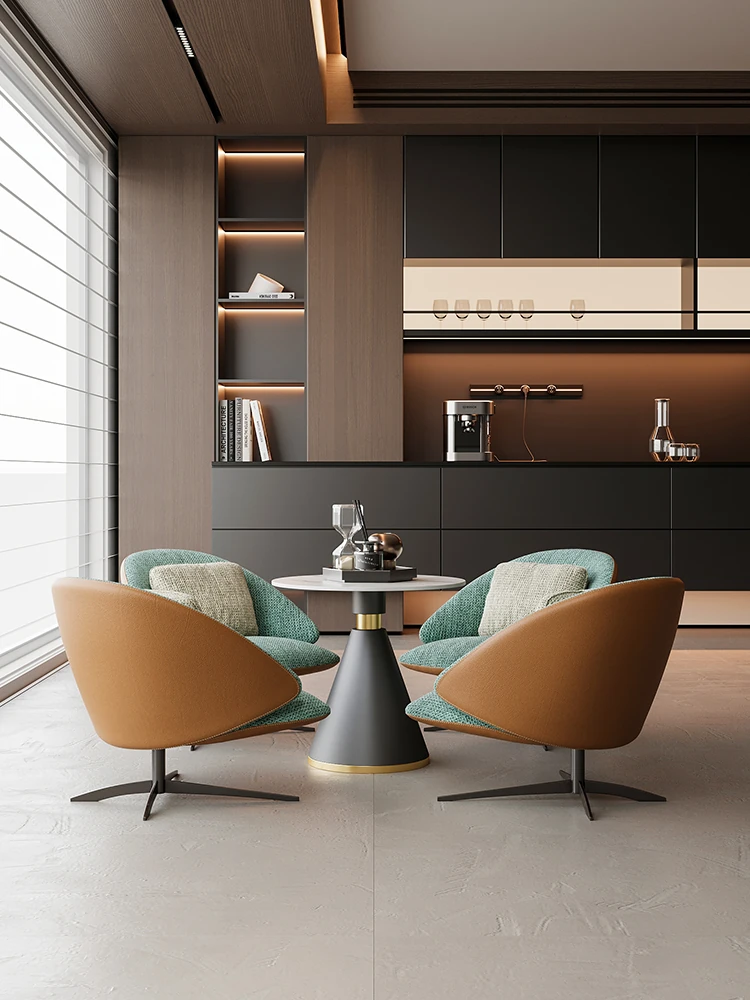 軽奢スタイルの不動産営業所用談話デスクセット!人気のリラックスソファと小さな円卓が一卓四椅子で、心地よい商談空間を演出します。おしゃれで機能的なオフィス空間を実現し、顧客の心を掴みます!