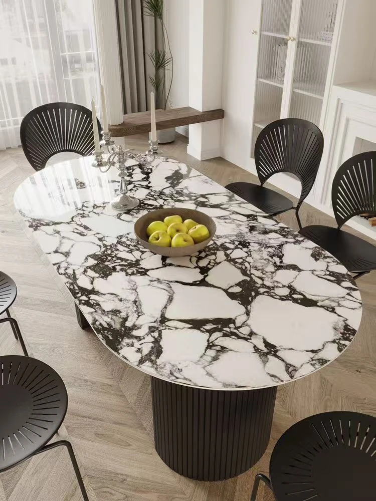 フレンチマーブルデザインのブルガリ風ダイニングテーブル、小型住宅に最適なレトロスタイル。モダンなライトラグジュアリー感を演出するシンプルな楕円形テーブルで、インテリアに華やかさをプラス!