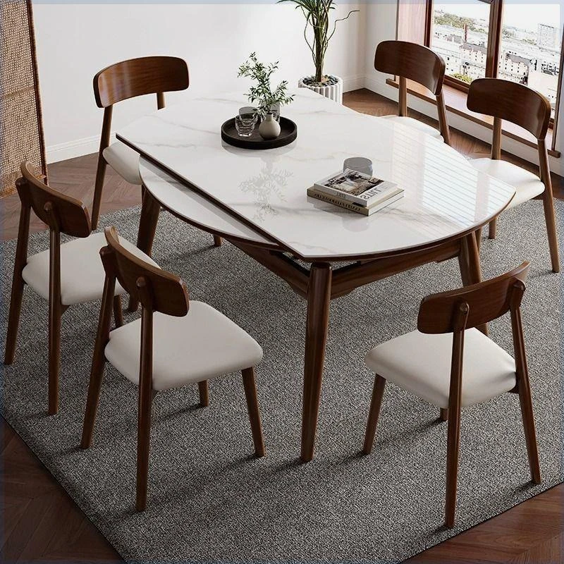 全実木クリーム風ダイニングテーブルセット - スペースに合わせて伸縮可能!折りたたみ式、四角と円形の2WAYデザイン。小型住宅に最適で、岩板製の食卓に電磁調理器付き。おしゃれで便利な食卓をお楽しみください!