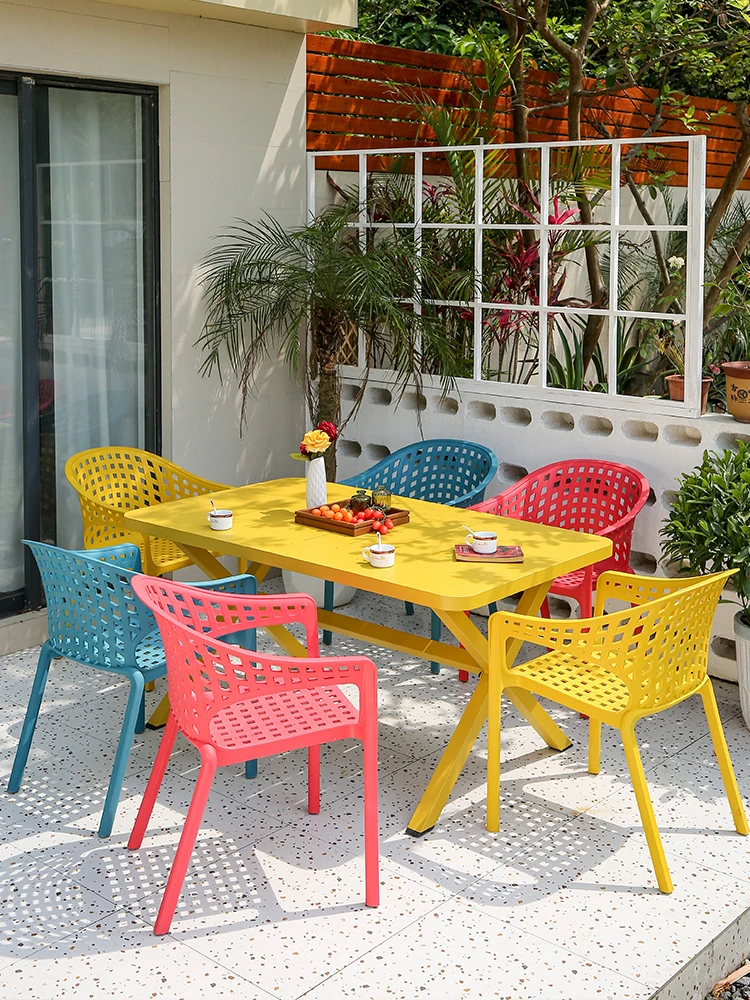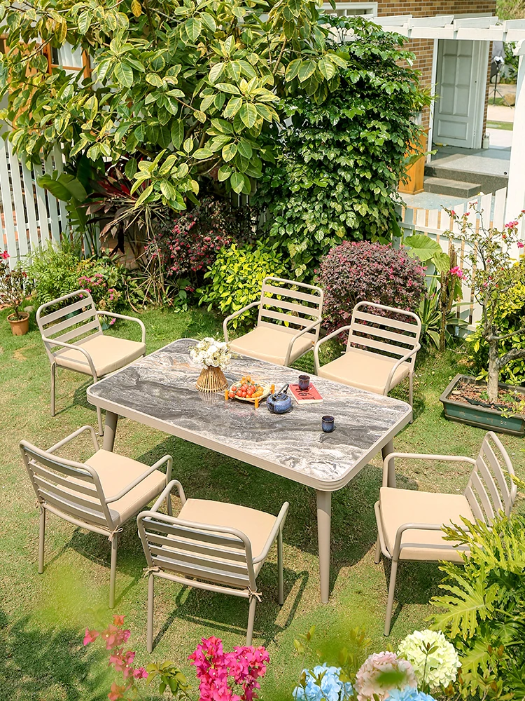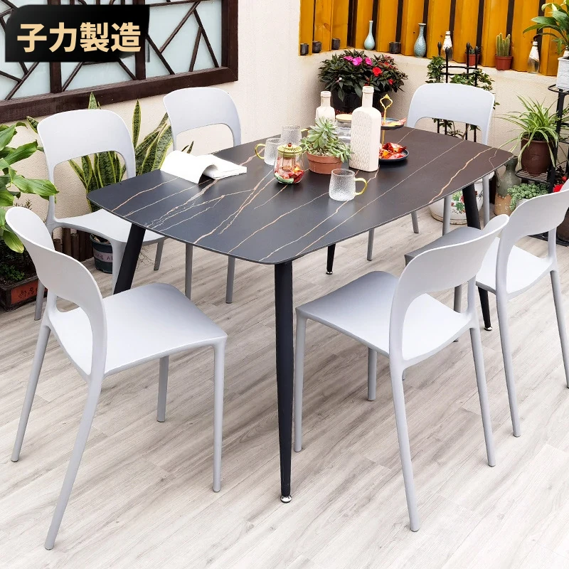 子力アウトドアレジャーテーブル&チェア、創造的なPVCチェアと背もたれ付きのロックプレートダイニングテーブル。カフェの屋外用に最適なシンプルでスタイリッシュなデザイン!