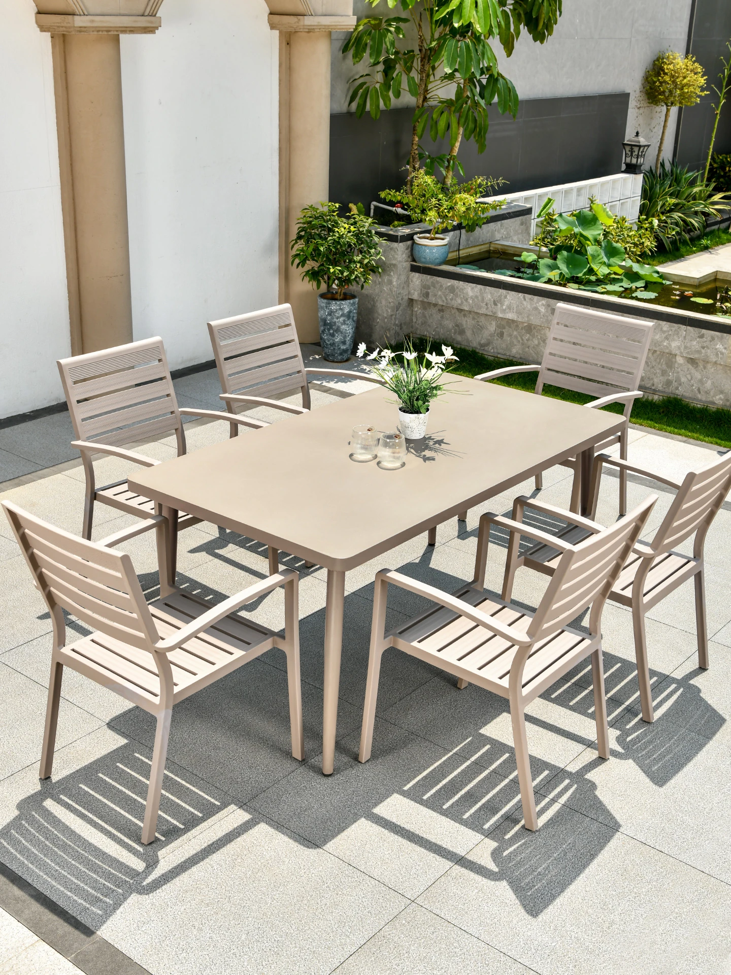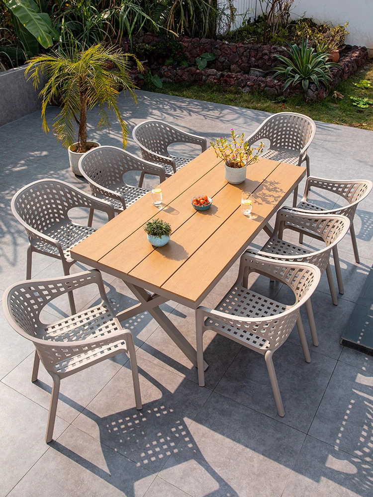 子力アウトドアテーブルセット - ガーデンやバルコニーに最適!防水・UVカット仕様のプラスチックウッド製ロングテーブルとラタンチェアで、快適なリラックスタイムをお楽しみください。