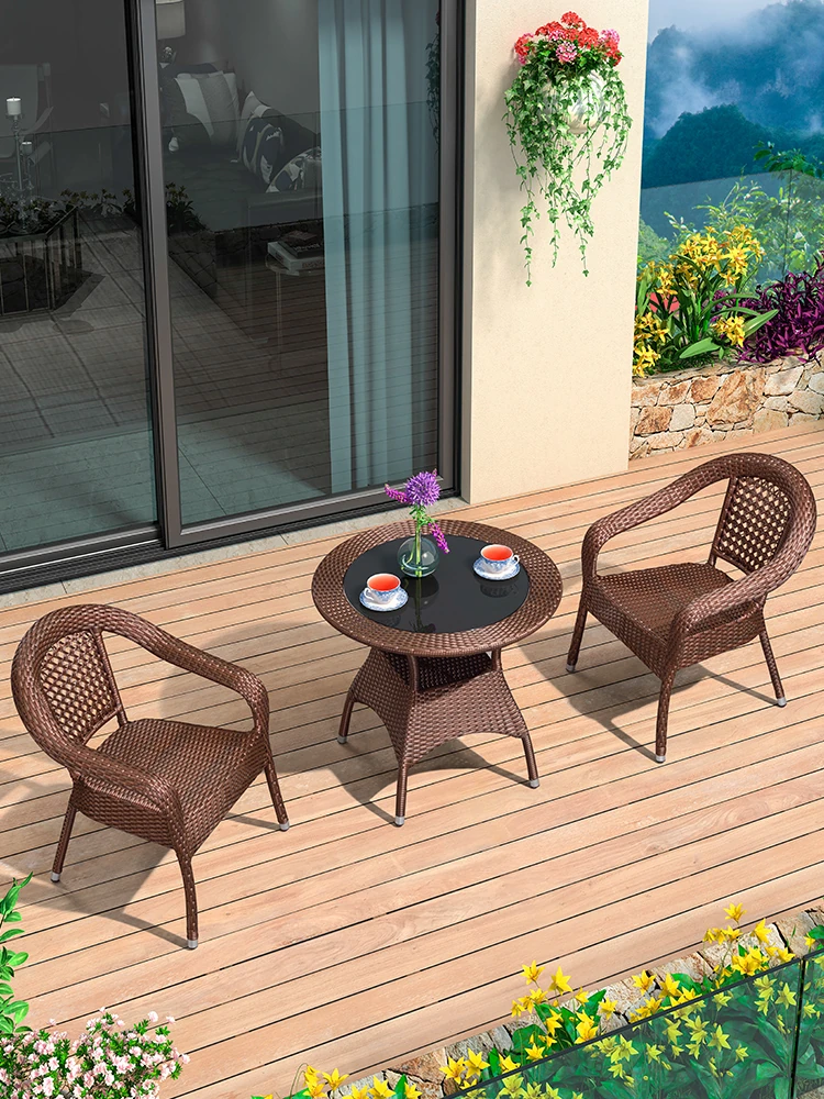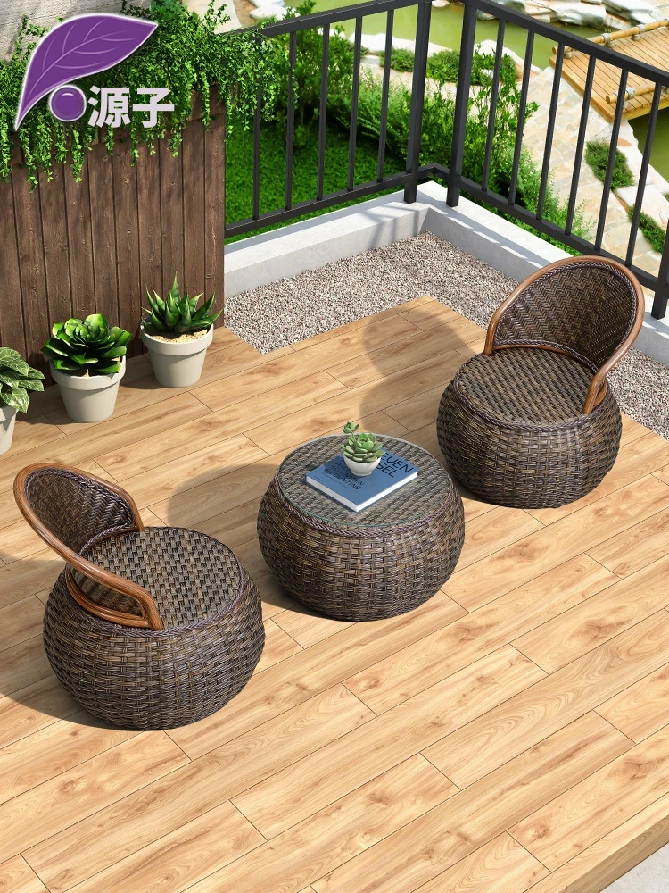 紫色の葉のバルコニー用リラックスチェア、ラタン製3点セット!アメリカンスタイルのクリエイティブなアウトドアテーブル&チェアで、あなたの庭をおしゃれに演出。心地よいひとときをお楽しみください!