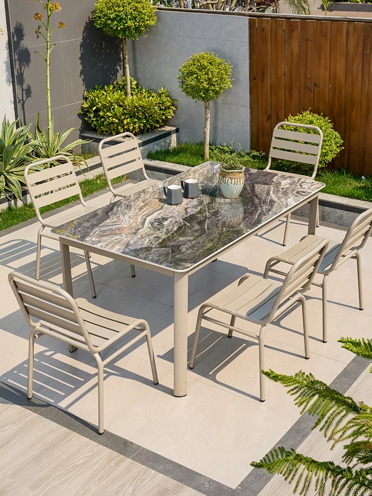 子力のテーブルと椅子 - おしゃれな庭やバルコニーにぴったり!岩板製のダイニングテーブルで、カフェやお茶の時間を楽しむための屋外用家具。リラックスしたひとときをお届けします。