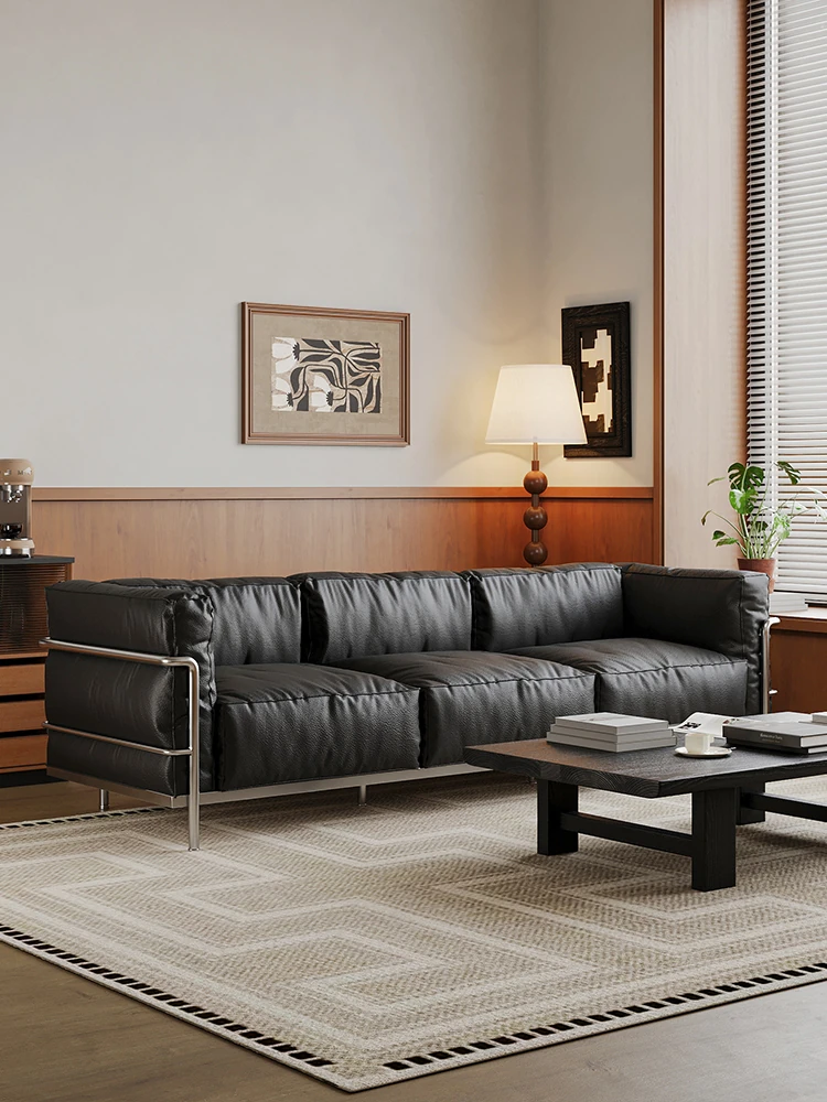 French Vintage Cream Leather Sofa - Modern Minimalist Black Genuine Cowhide Couch for Small Living Rooms - Perfect for Home Décor and Comfort