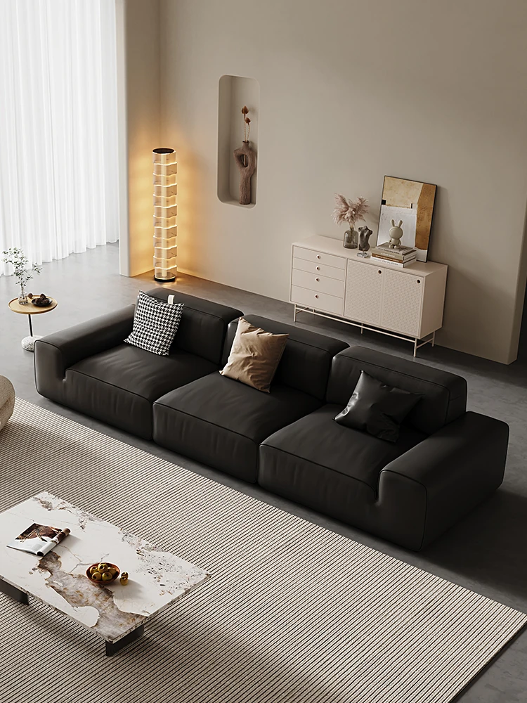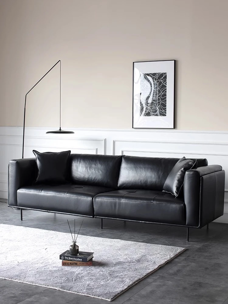 Italian Minimalist Black Leather Sofa - Premium Top-Grain Cowhide Block Sofa for Living Room, Perfect for Small to Medium Spaces