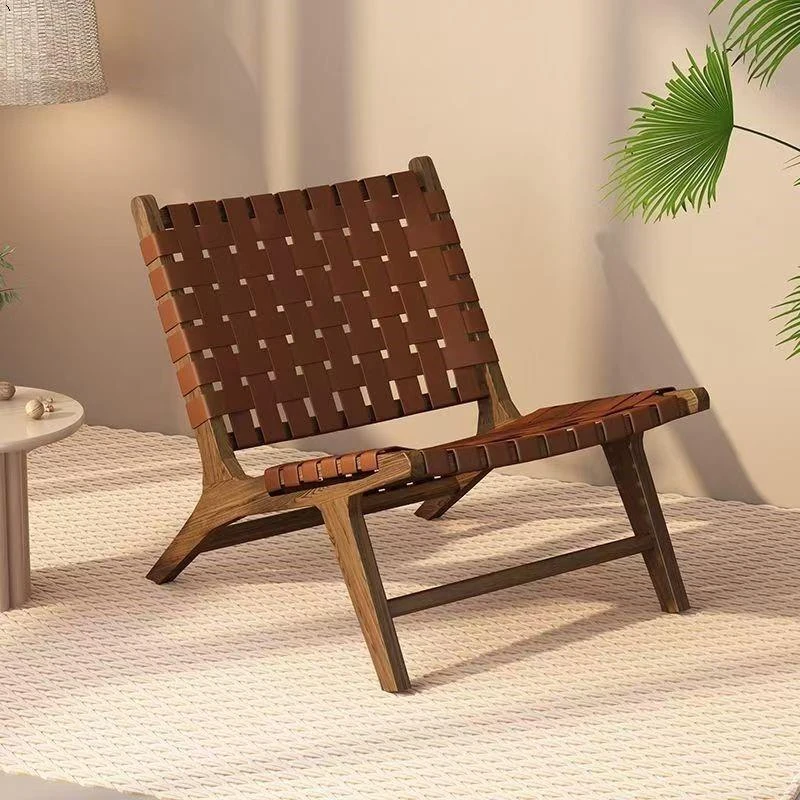 Nordic Solid Wood Vintage Saddle Chair - Retro Single Sofa for Hotels and B&Bs, Boho Woven Folding Chair with Backrest, Rattan Lounge Chair