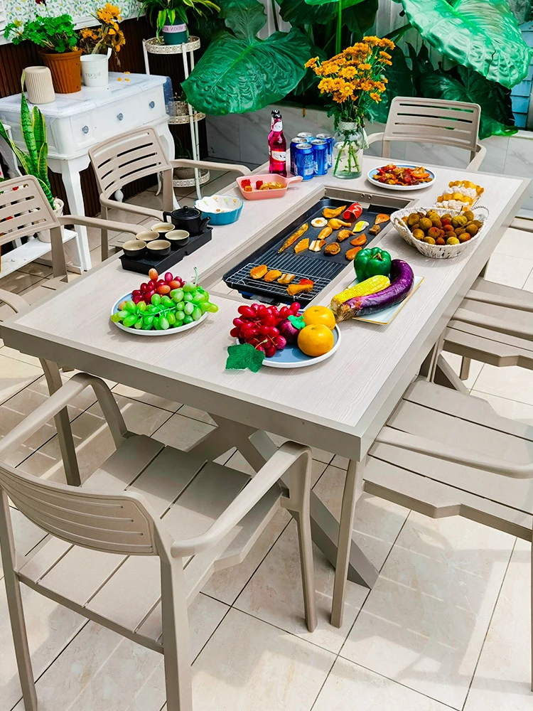 Zili Outdoor Nordic Style BBQ Table with Wood Grain Finish - Aluminum Alloy Dining Set for Home Use, Perfect for Electric and Charcoal Grilling Outdoors.