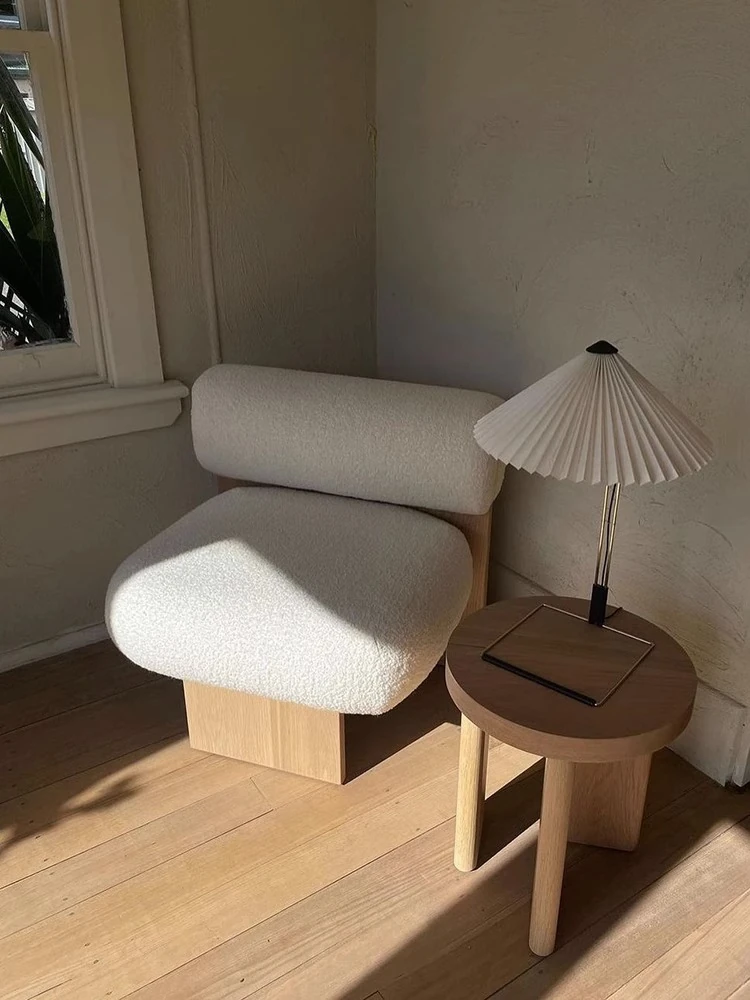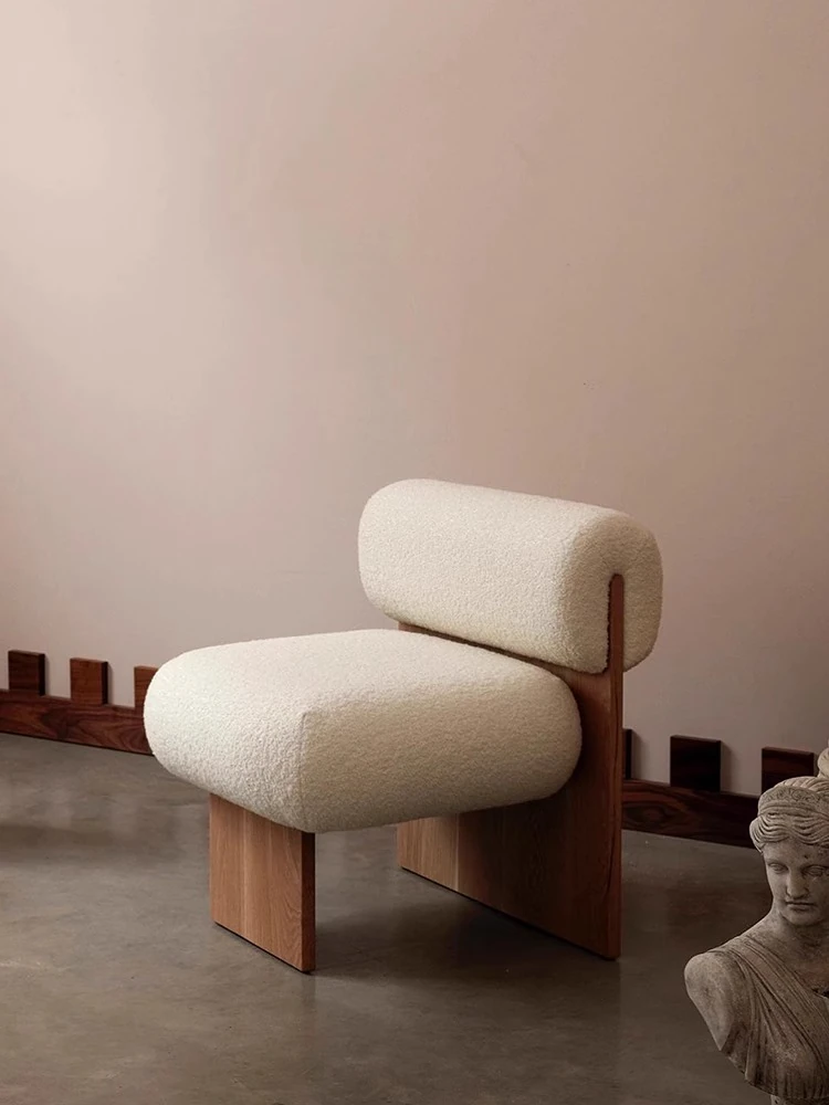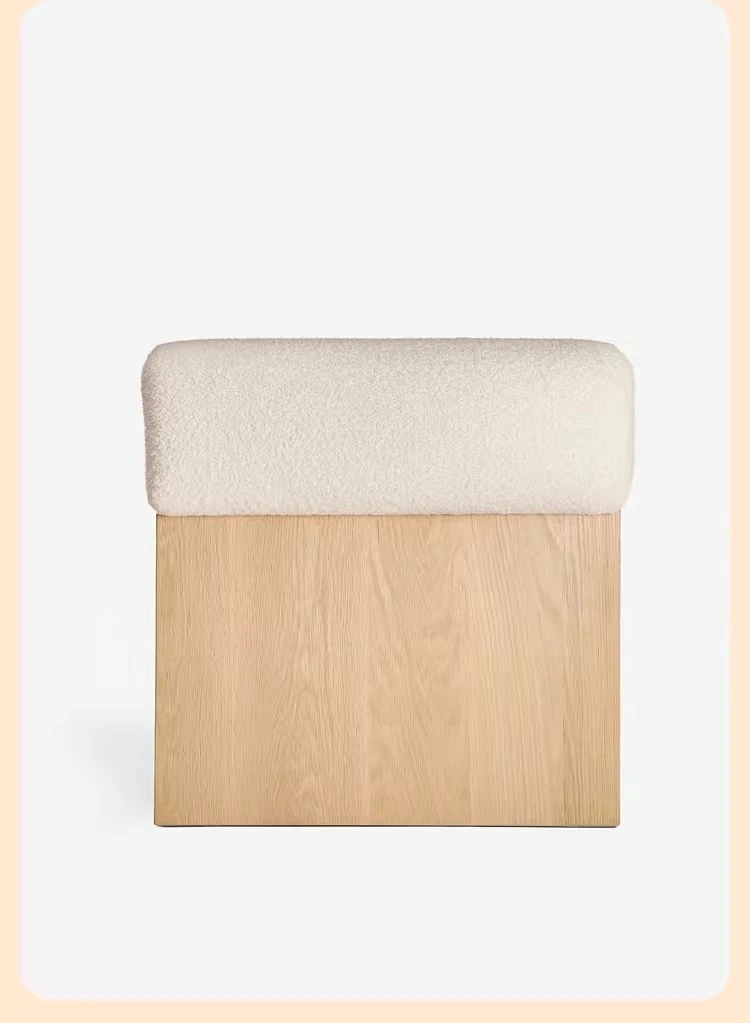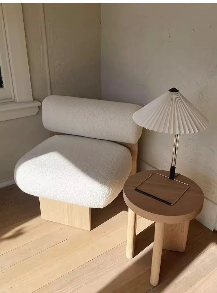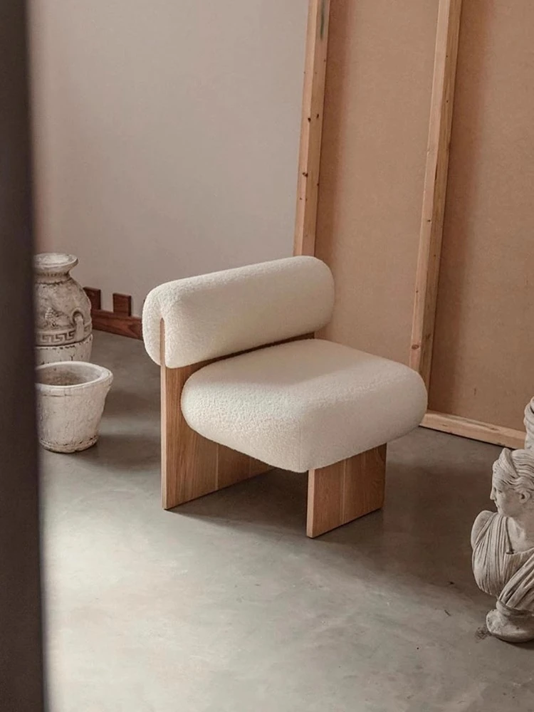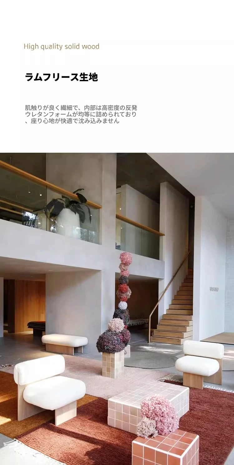 小木槿の家具、侘寂スタイルの羊毛フリースと無垢材のダイニングチェア。北欧・和風デザインのトレンディなメイクアップチェア、個性豊かで創造的な椅子!あなたの空間にぴったりの一品です。