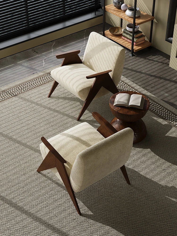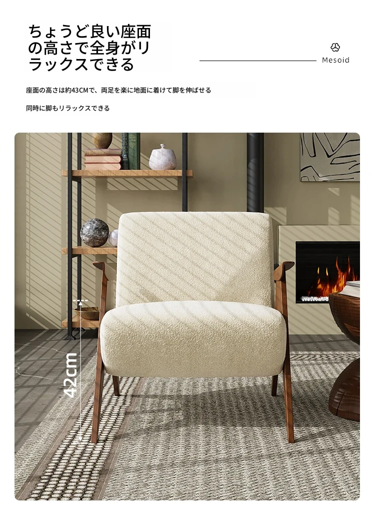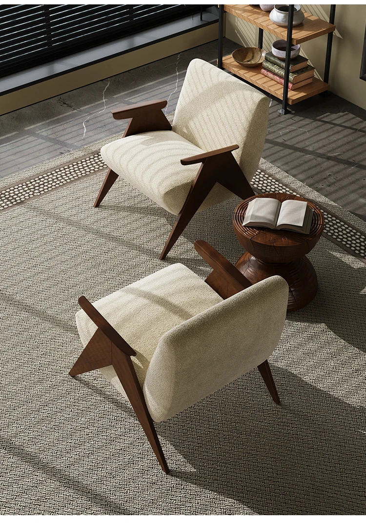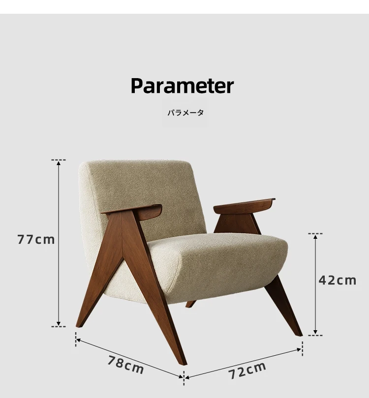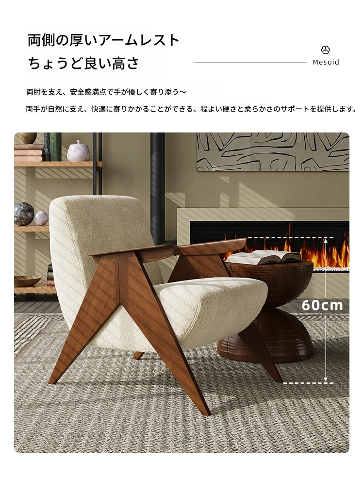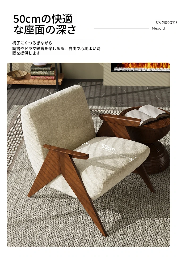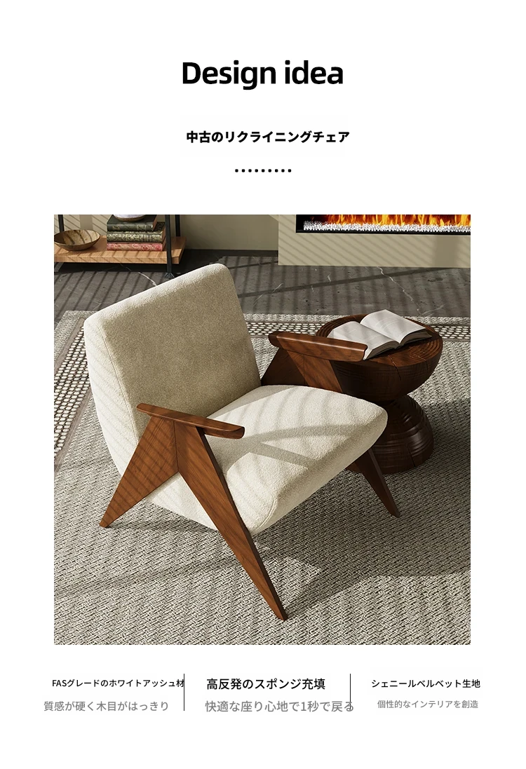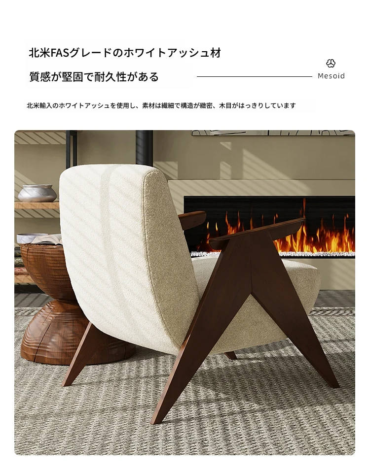 小木槿デザインの一人掛けソファ - 家庭用リビングやバルコニーに最適な無垢ホワイトアッシュ材の中世風リラックスチェア。快適さとスタイルを兼ね備えた、あなたのくつろぎ空間を演出します!