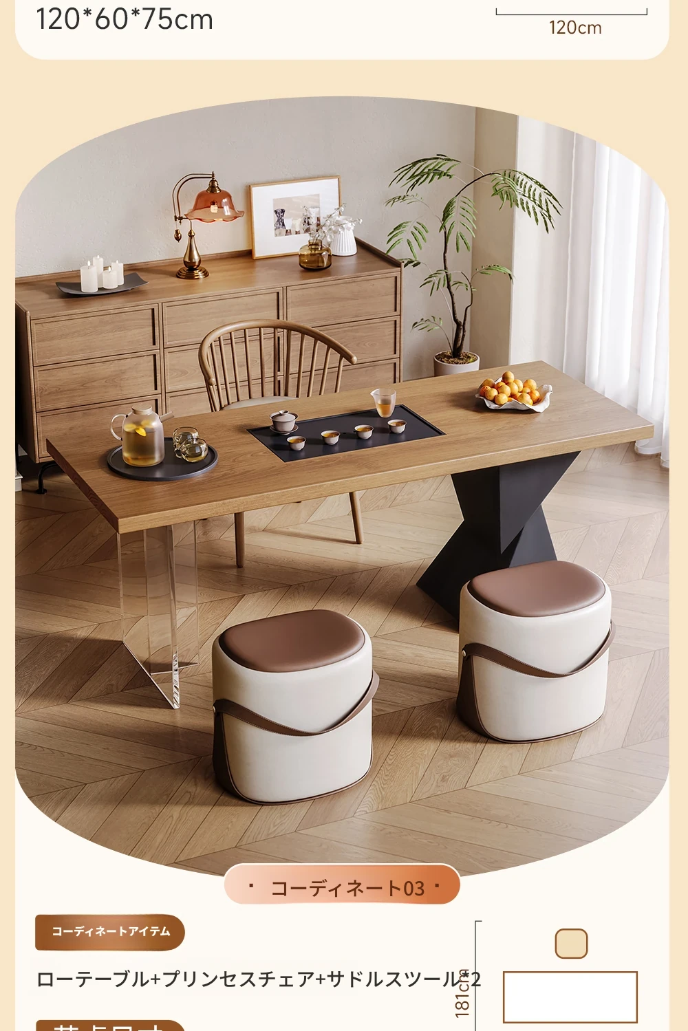【人気商品】1.2m大葉松の茶卓+プリンセスチェア+サドルスツール*2