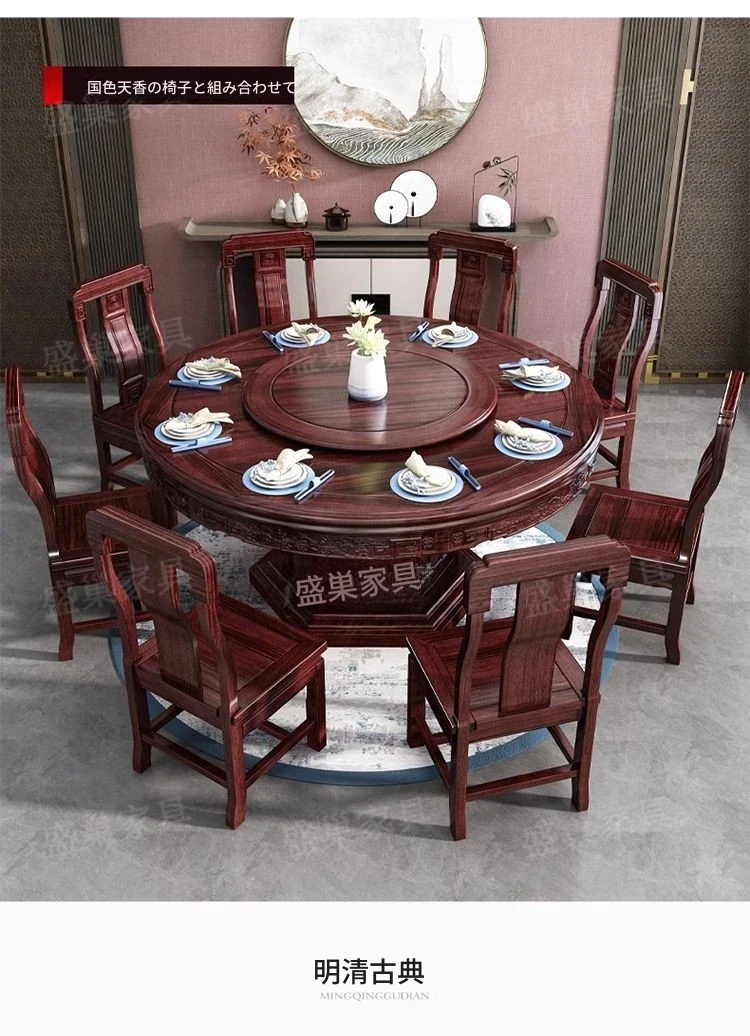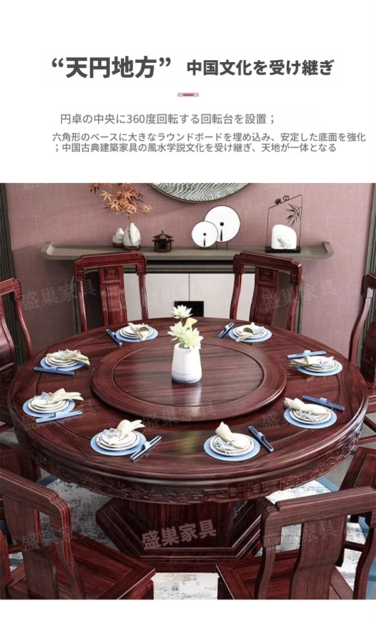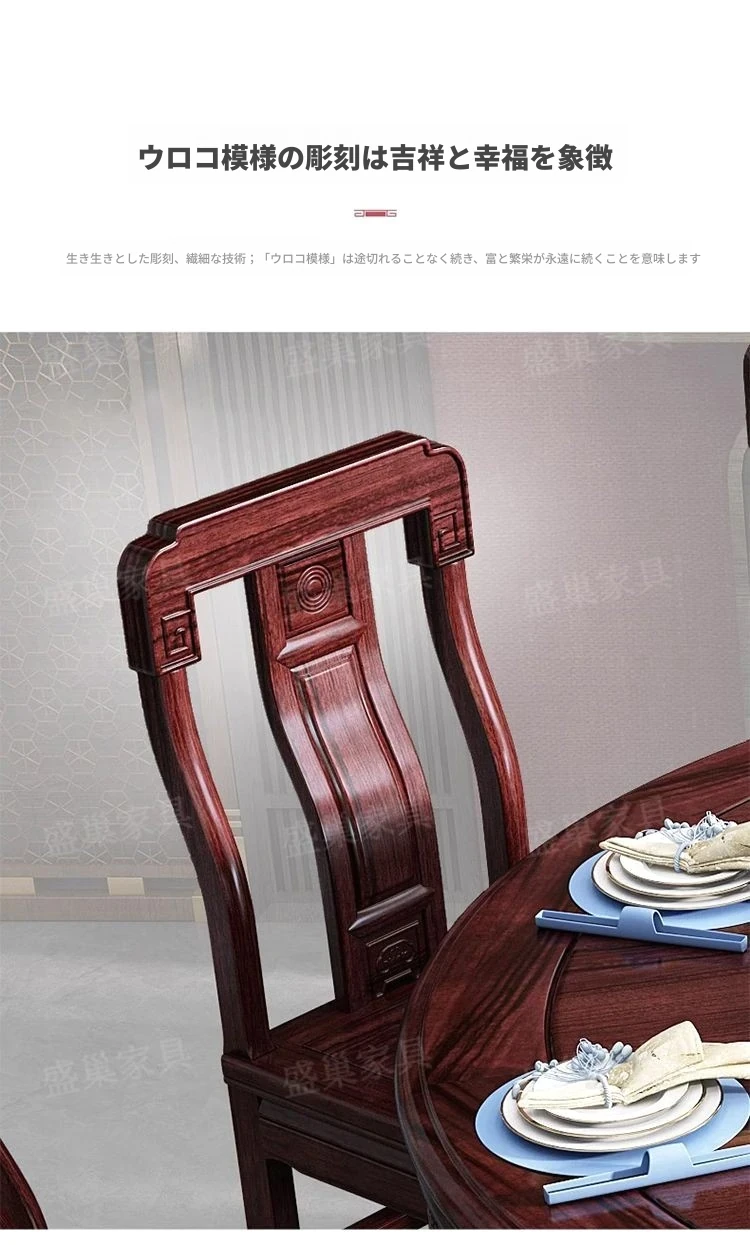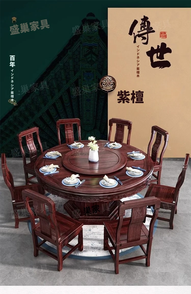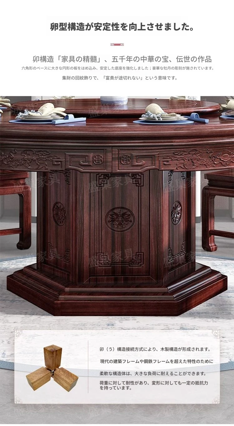 新中式デザインのインドネシア産紫檀材使用!豪華な赤褐色の実木ダイニングテーブル、回転式椅子付き。美しい彫刻と伝統的な榫卯構造で、家族や友人との食事時間を特別に彩ります。