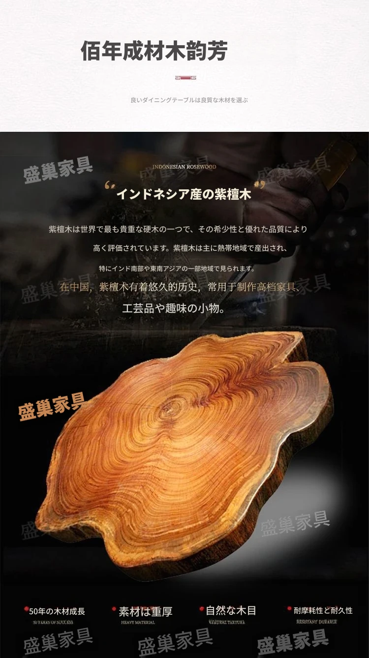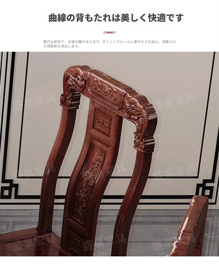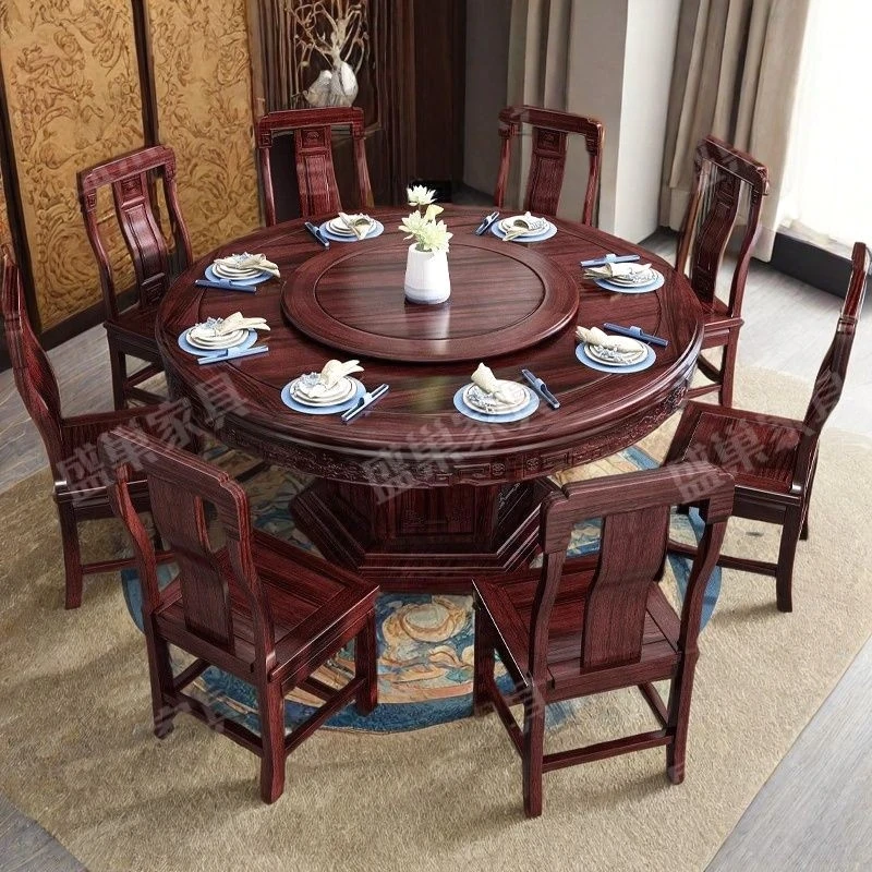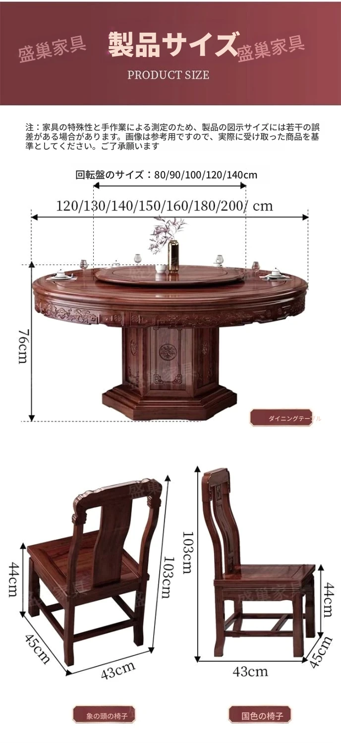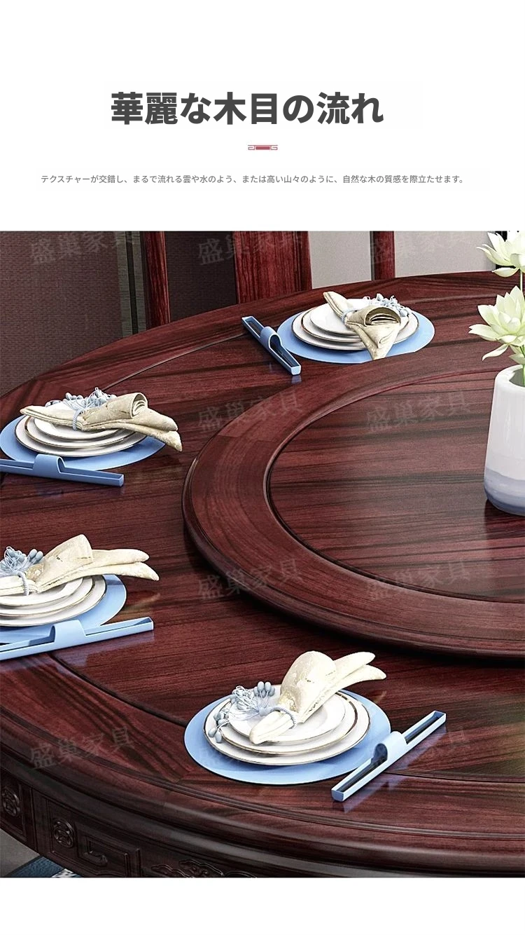 新中式デザインのインドネシア産紫檀材使用!豪華な赤褐色の実木ダイニングテーブル、回転式椅子付き。美しい彫刻と伝統的な榫卯構造で、家族や友人との食事時間を特別に彩ります。