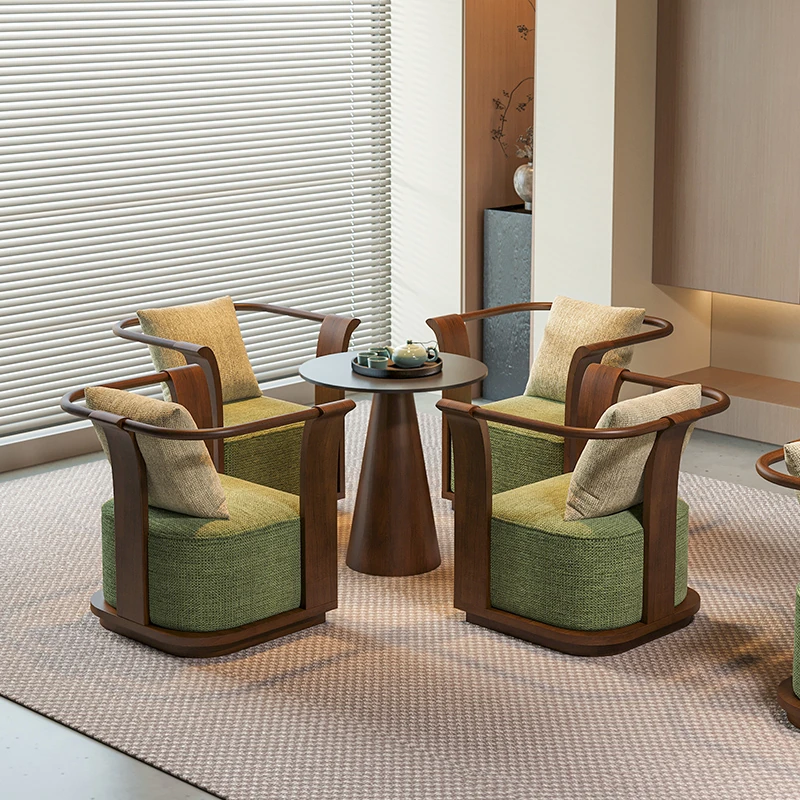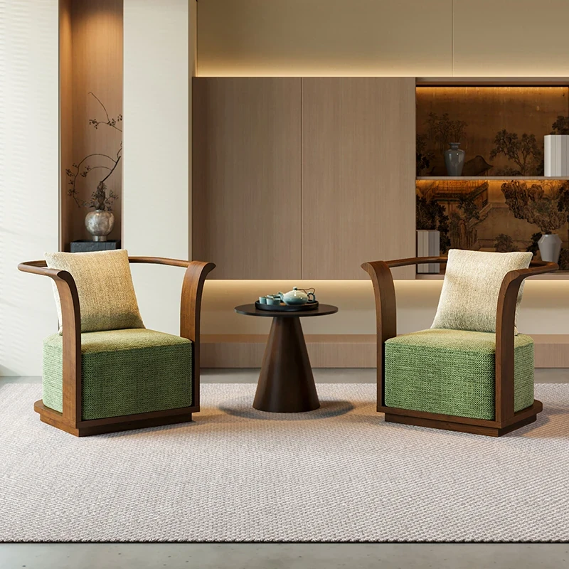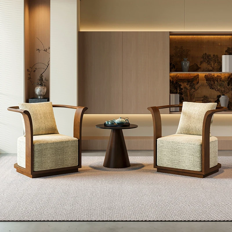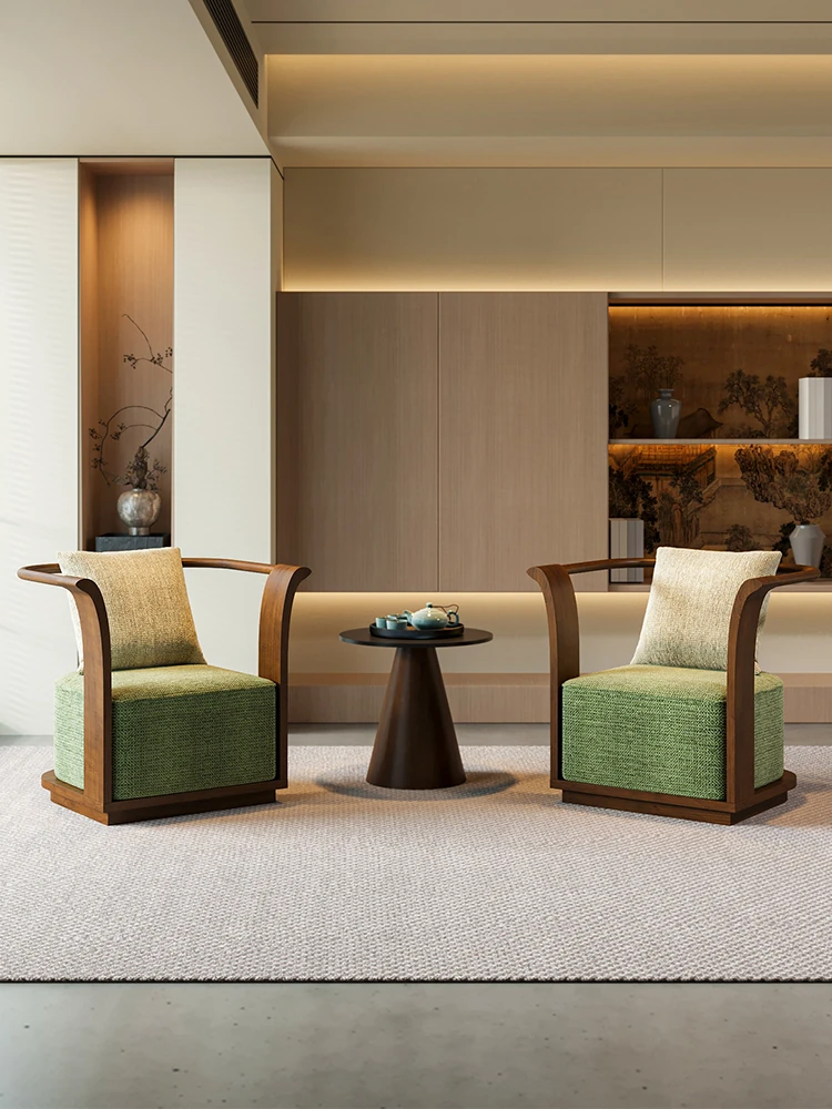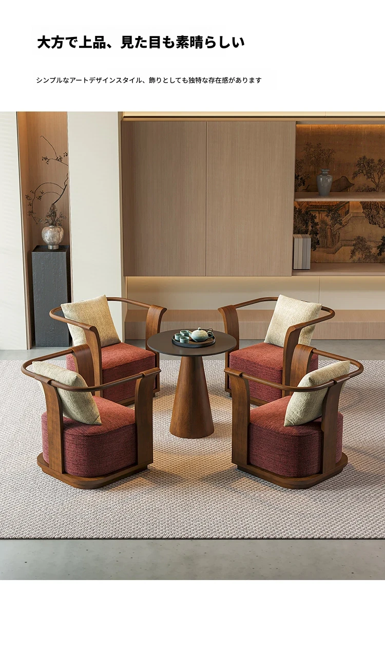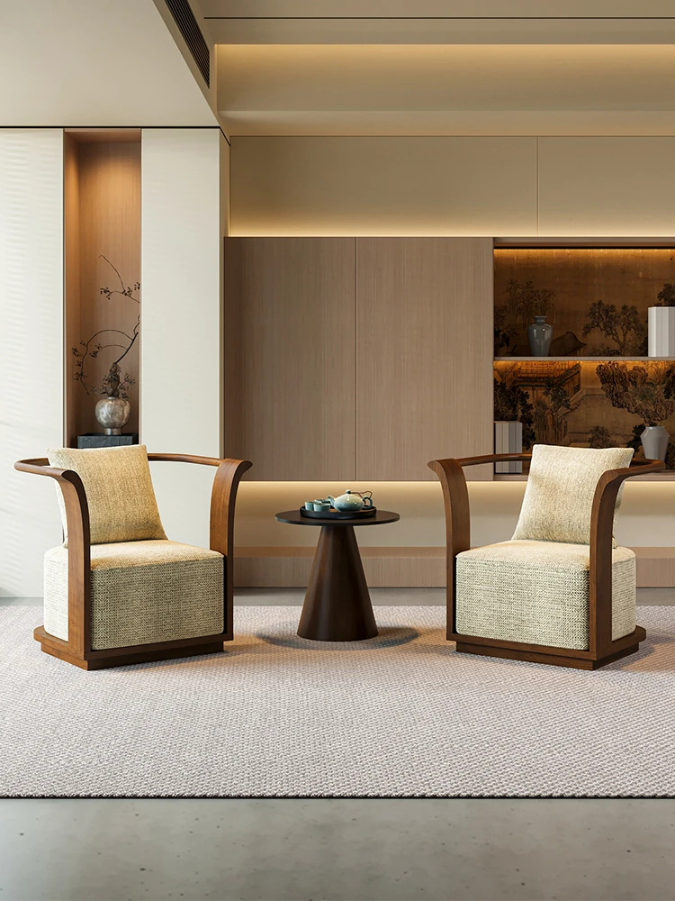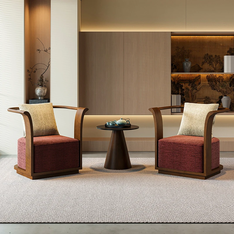 新中式スタイルの無垢材ソファチェア - 売り場、ホテルロビー、美容院、展示会に最適な一卓二椅子セット!洗練されたデザインで、心地よい空間を演出します。お客様との大切なひとときをより特別に。