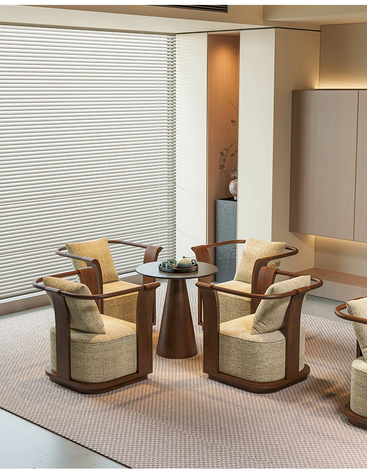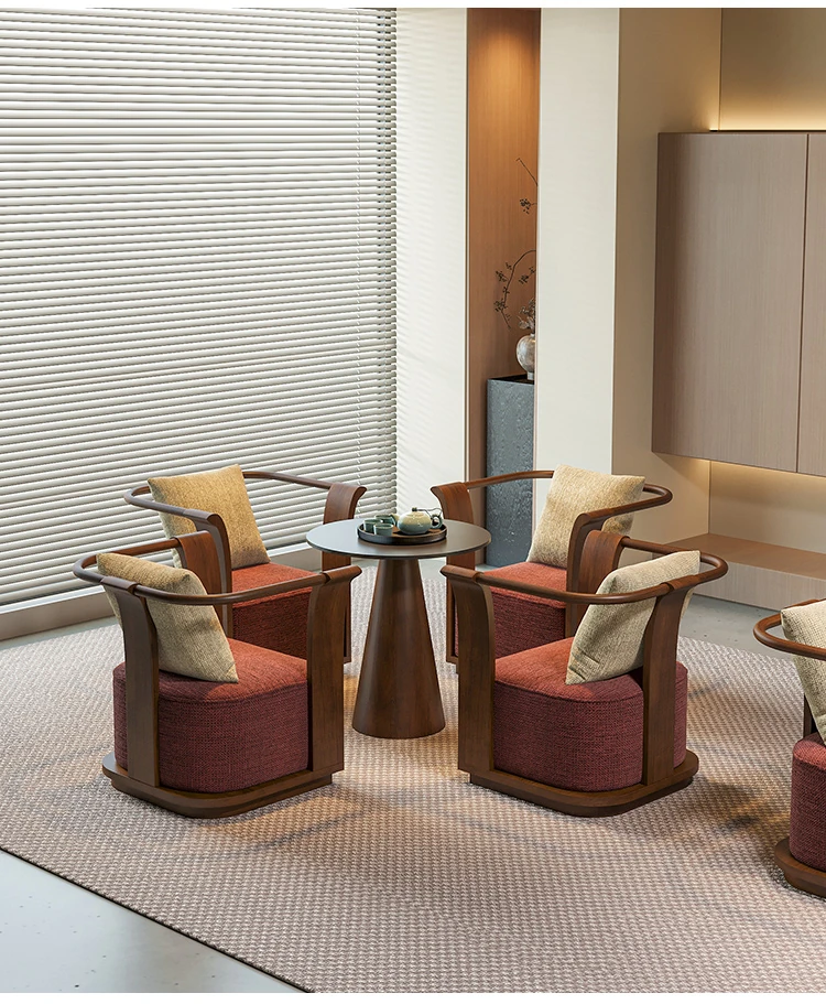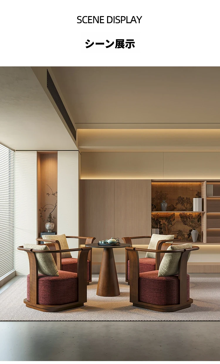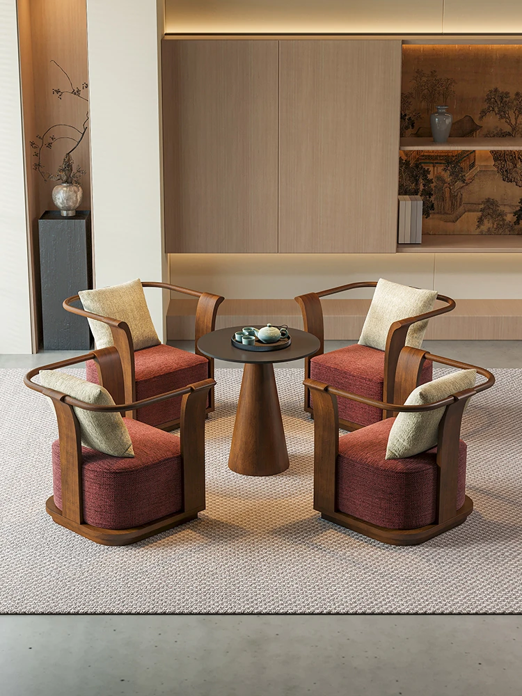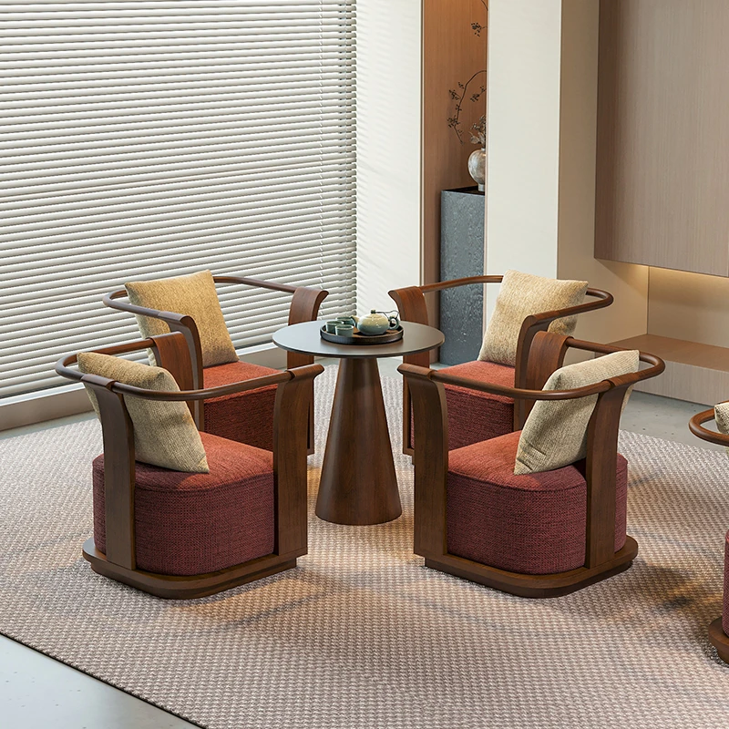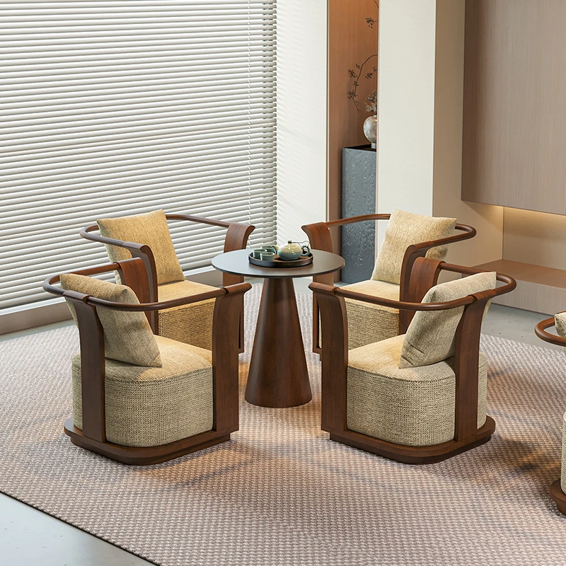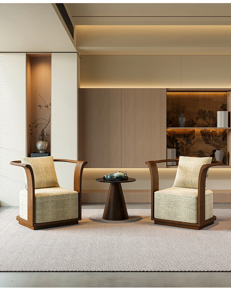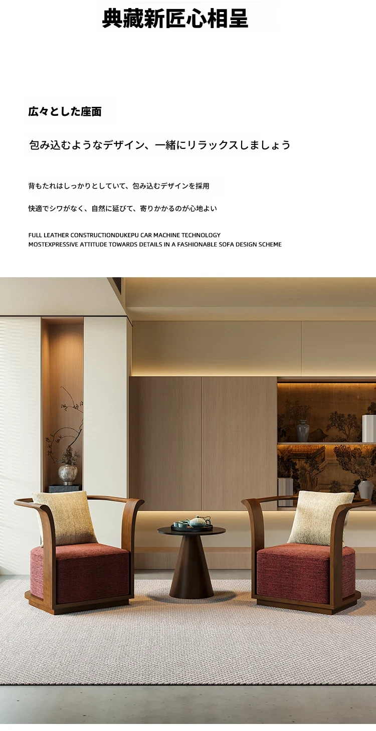 新中式スタイルの無垢材ソファチェア - 売り場、ホテルロビー、美容院、展示会に最適な一卓二椅子セット!洗練されたデザインで、心地よい空間を演出します。お客様との大切なひとときをより特別に。