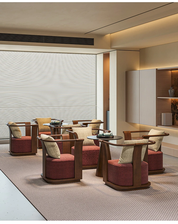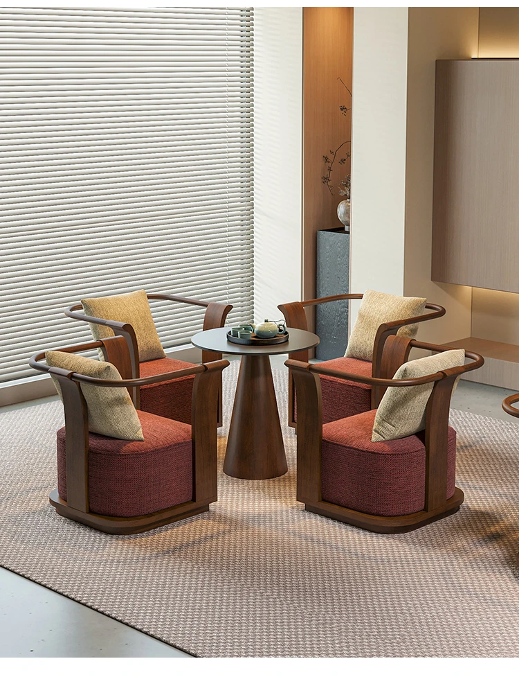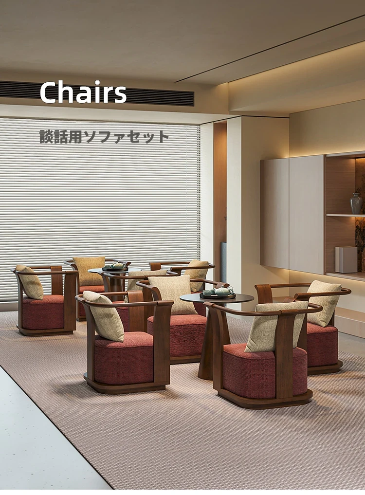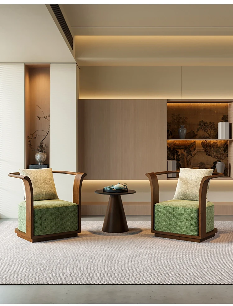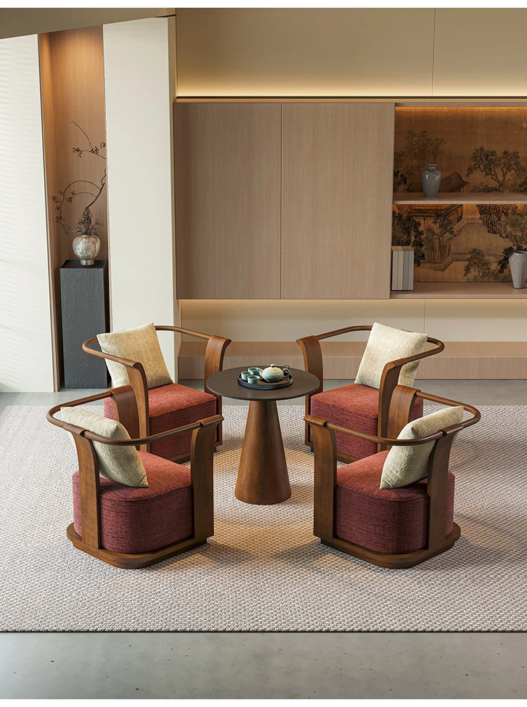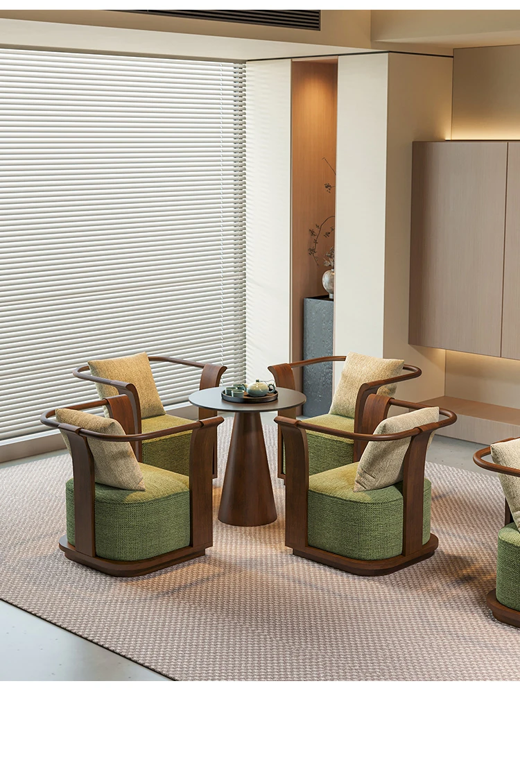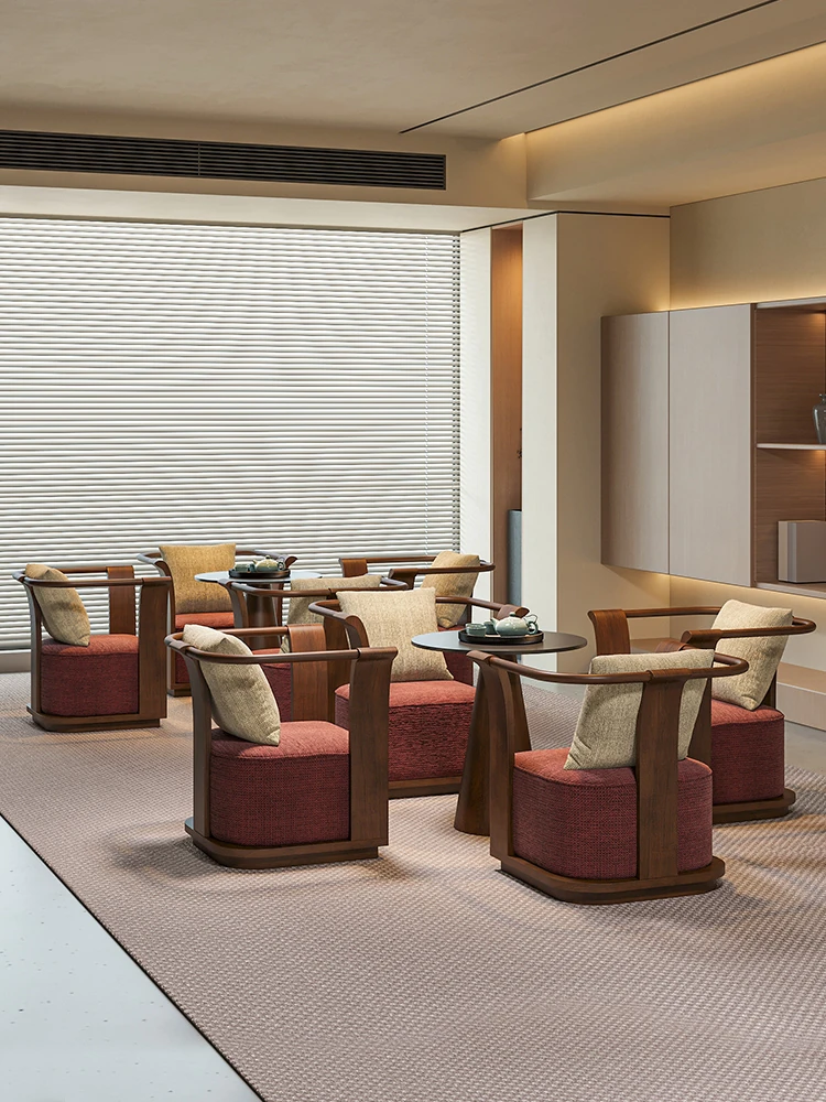 新中式スタイルの無垢材ソファチェア - 売り場、ホテルロビー、美容院、展示会に最適な一卓二椅子セット!洗練されたデザインで、心地よい空間を演出します。お客様との大切なひとときをより特別に。