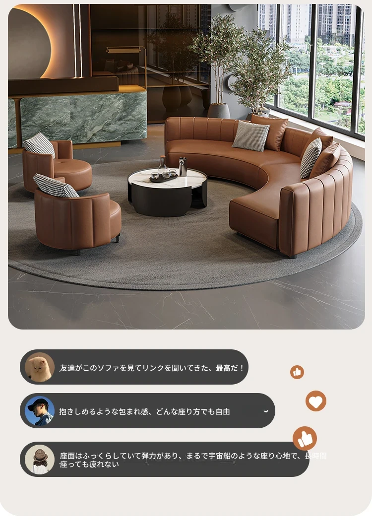 高級感あふれる半円形ソファ|美容院やホテルの休憩エリアに最適!おしゃれなデザインで接客スペースを華やかに演出。多様な形状のカスタマイズも可能!お客様との特別なひとときをお楽しみください。